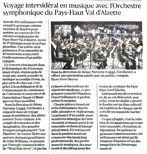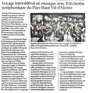 « Exceptionnel ! De grandes pointures ! Un vrai show multipliant les surprises ! » Ce samedi 28 février, à Kanfen, Les Trompettes de Lyon ont ravi les 600 mélomanes venus assister à leur concert, à l'occasion du Printemps musical en Pays mosellan. Durant une heure et demi, la formation, en tournée actuellement avec son dernier spectacle « Avis de Trompettes », mis en scène par François Rollin, a électrisé le public. Ce dimanche 1er mars, toujours au gymnase de Kanfen, à 16 h, place à L’Orchestre symphonique du Pays-Haut Val d’Alzette.